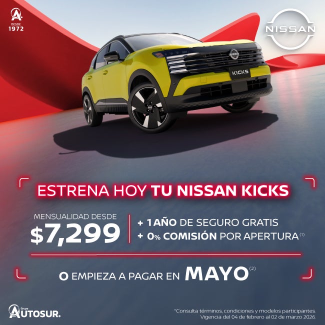 Se aplica para KICKS ADVANCE CVT 26 en plan tradicional Credi Nissan con el 40% de enganche a 72 meses, 1 año de seguro gratis y 0% comisión por apertura. Tasa anual de 11.80% y CAT promedio sin IVA de 13.3%. (2) Aplica para todas las versiones Kicks 2025 en operaciones de crédito celebradas con Credi Nissan. No aplica con otras promociones ni en compra de flotillas. Para conocer planes y modalidades de crédito, verificar precios, requisitos de contratación, comisiones, disponibilidad, términos y condiciones, consulta a tu Distribuidor Autorizado Nissan. Vigencia del 04 de febrero al 02 de marzo 2026.