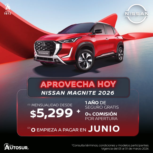 Se aplica para MAGNITE ADVANCE CVT 26 en plan tradicional CrediNissan con el 35% de enganche a 72 meses, 1 año de seguro gratis y 0% comisión por apertura. Tasa anual de 9.89% y CAT promedio sin IVA de 11.3%. (2) Aplica para todas las versiones Magnite 2026 en operaciones de crédito celebradas con CrediNissan. No aplica con otras promociones ni en compra de flotillas. Para conocer planes y modalidades de crédito, verificar precios, requisitos de contratación, comisiones, disponibilidad, términos y condiciones, consulta a tu Distribuidor Autorizado Nissan. Vigencia del 03 al 31 de marzo 2026.